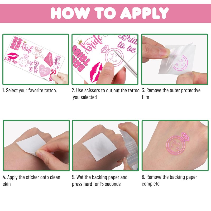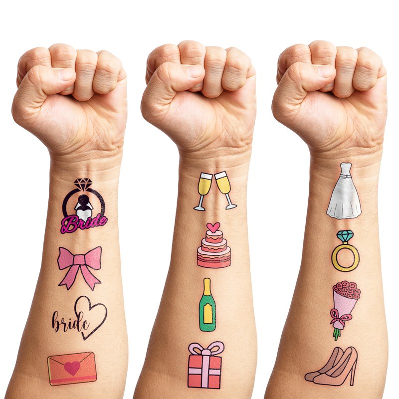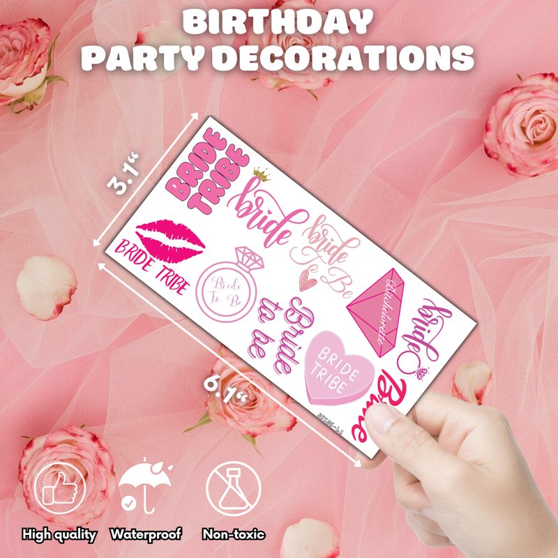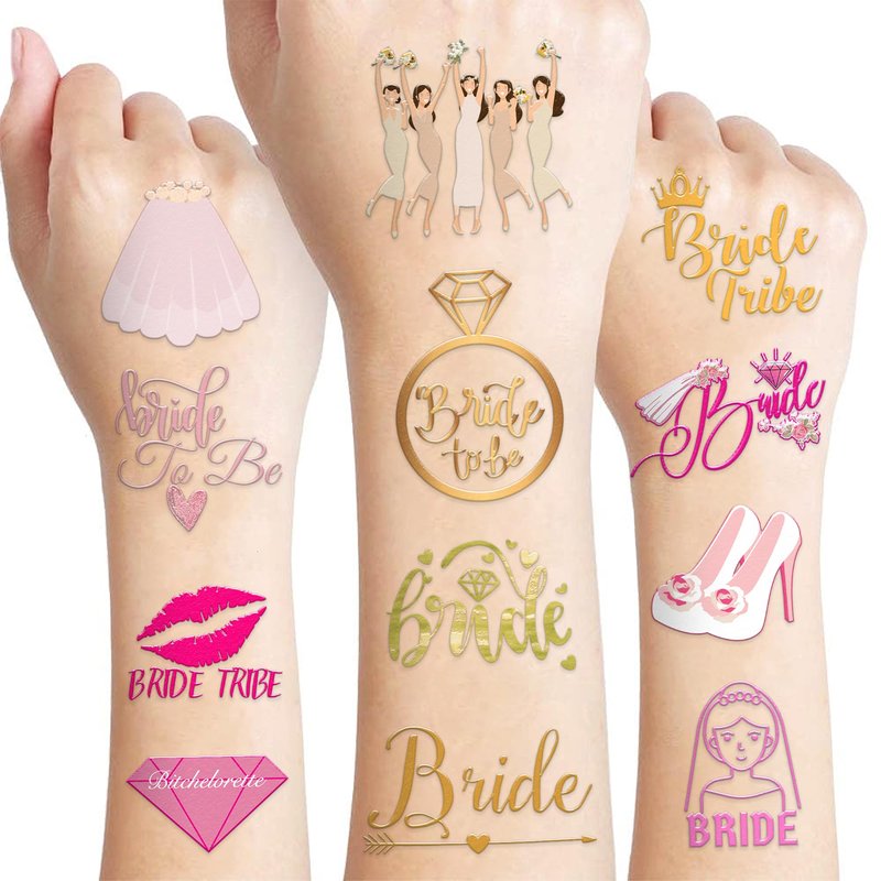 - 👰 TATTOOS FOR BRIDE TRIBE THEMED DECORATION: BRIDE TRIBE TATTOOS featuring 10 sheets with 100 pcs design for Bride, Bride Tribe, Bridal Shower, Bride To Be, Girls, Woman, adult. Each sheet measures 6.1 * 3.1 inches. You can temporarily tattoo them on your body or objects such as phones, bottles, laptop…