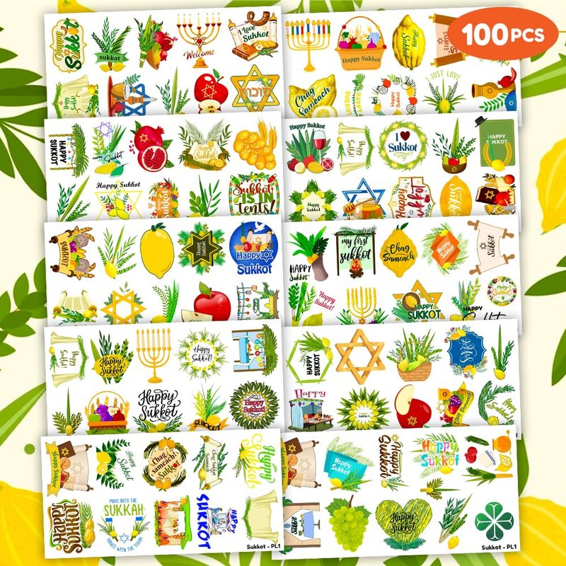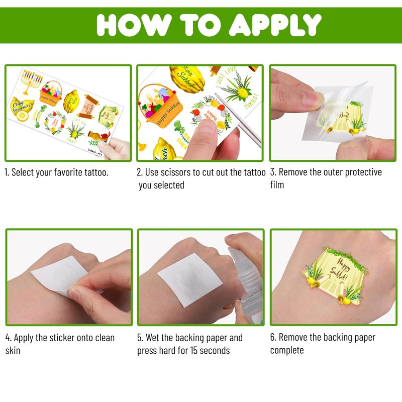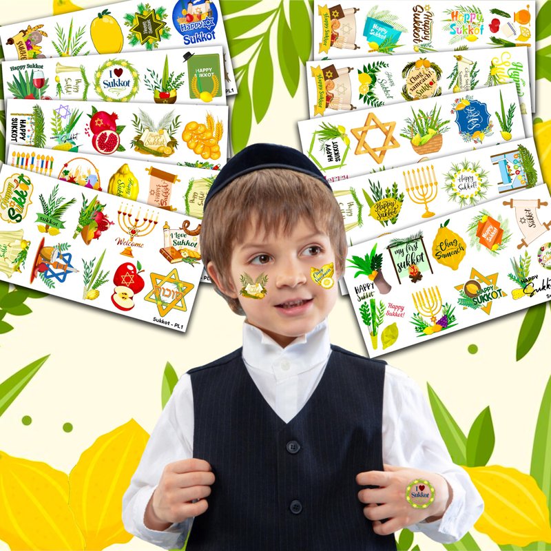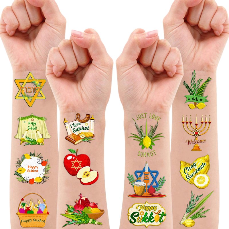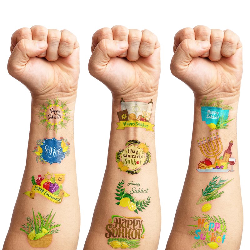 - Pattern rich: Happy Sukkot Sukkah Cute Chag Sameach Harvest Jewish Temporary Tattoos include 10 Sheets 100 PCS, the size of each sheet is 6.1 * 3.1 inches. Easy to share,even if a lot of people's parties, you can have a different tattoo with others.These adorable tattoos will keep you and your little ones – and their friends – occupied for a while.