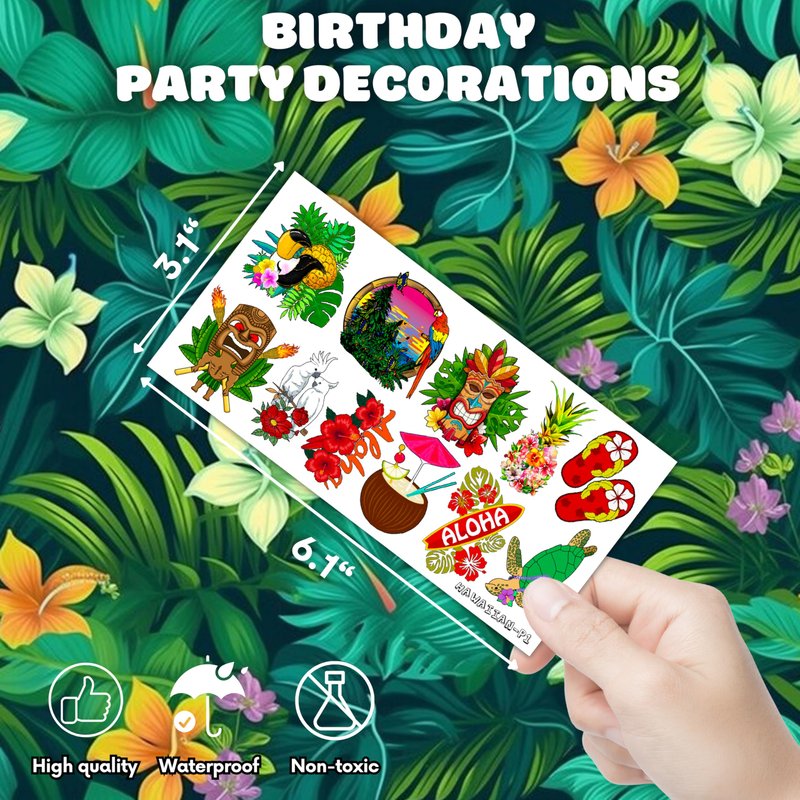 - 🍍HAWAIIAN PARTY DECORATIONS: Hi everyone! An amazing set of 10 sheets including 100 a size of 6.1 by 3.1 inches. These HAWAIIAN tattoo pieces will be sent to you quickly, place your order to get these temporary tattoos.