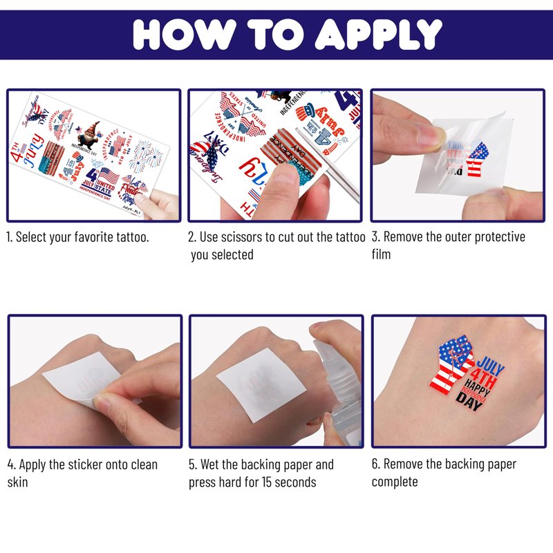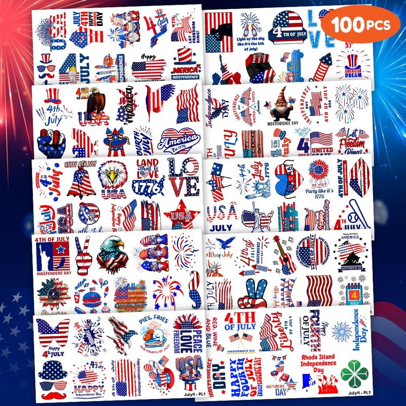 - Pattern rich: Independence Day American Cute 4th of July Fourth of July Temporary Tattoos include 10 Sheets 100 PCS, the size of each sheet is 6.1 * 3.1 inches. Easy to share,even if a lot of people's parties, you can have a different tattoo with others.These adorable tattoos will keep you and your little ones – and their friends – occupied for a while.
