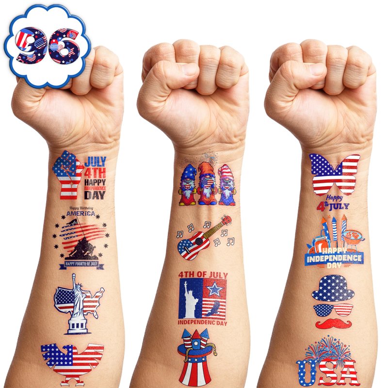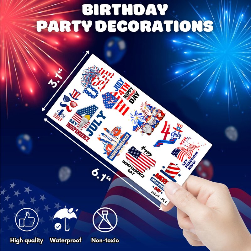 - Widely used: Independence Day American Cute 4th of July Fourth of July Temporary Tattoos pieces are suitable for many occasions such as birthday party supplies, party decorations, party favors, party bags, DIY decorations, pool and the beach or gift. Temporary tattoos are the best party favors and goodie bags fillers ever for any kind of celebration!
