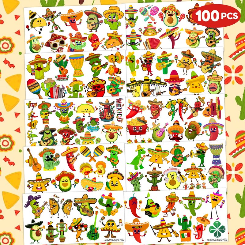 100 PCS Mexican Fiesta Mariachi Taco Temporary Tattoos Stickers Birthday Party Decorations Favors Supplies Cinco De Mayo Avocado Taco Mexican Festival Theme Girls Boys Classroom School Prizes Reward