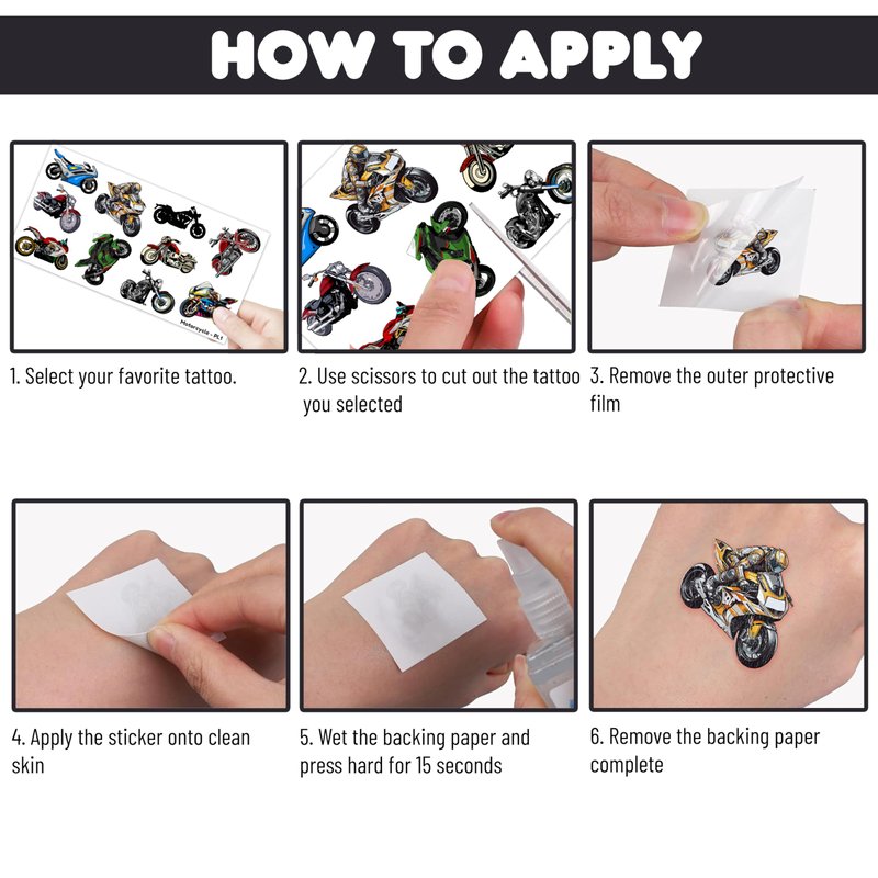 - Pattern rich: Motorcycle Dirt Bike Motocross Racing Rider Biker Temporary Tattoos include 10 Sheets 100 PCS, the size of each sheet is 6.1 * 3.1 inches. Easy to share,even if a lot of people's parties, you can have a different tattoo with others.These adorable tattoos will keep you and your little ones – and their friends – occupied for a while.