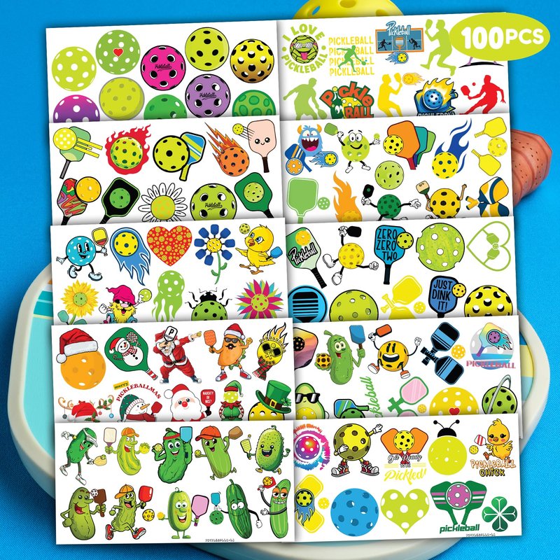 - 🎾TATTOOS FOR PICKLEBALL THEMED DECORATION: PICKLEBALL TATTOOS for people who love pickleball, sports. Featuring 10 sheets with 100 PCS of lovely, fun and colorful design. Each sheet measures 6.1 * 3.1 inches. You can temporarily tattoo them on your body or objects such as phones, bottles, laptop…
