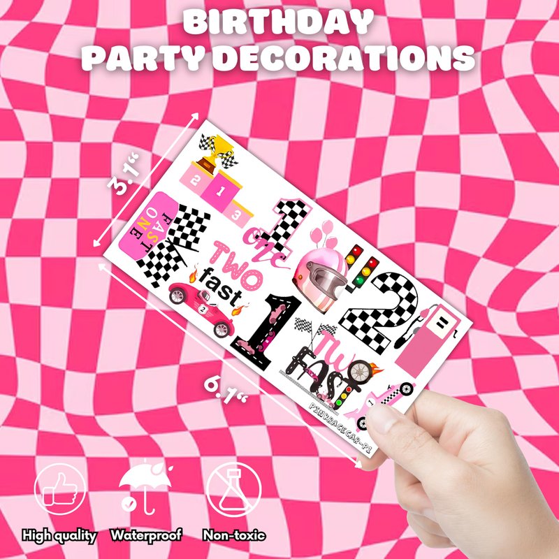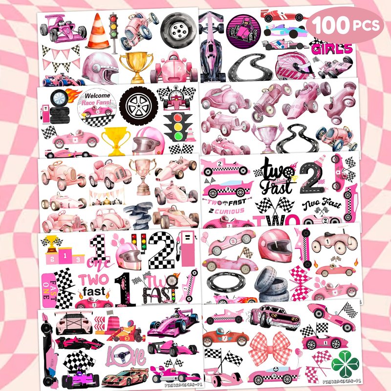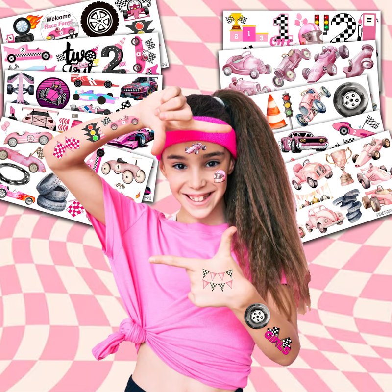 - 🛞RACE GIRL: Any gathering can benefit from the lively vibes our temporary Pink race car tattoos can bring. For your event, pick from eye-catching themes including Fast One First 1st, Two Fast, Pink Checkered, or Race Girl. So, to add a unique touch to your celebration, order our Pink Race Car tattoos right away.