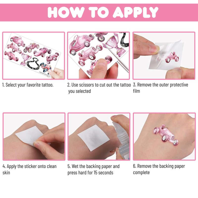 - 🏎️PINK RACE CAR: Hi everyone! An amazing set of 10 sheets including 100 a size of 6.1 by 3.1 inches. These Pink Race Car tattoo pieces will be sent to you quickly, place your order to get these temporary tattoos.