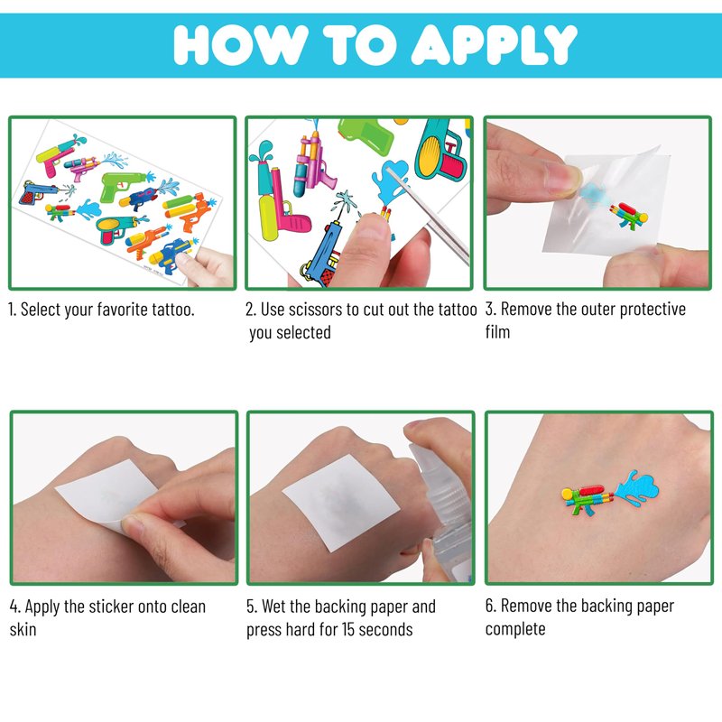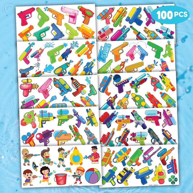 - 🔫 TATTOOS FOR WATER GUN THEMED DECORATION: WATER GUN TATTOOS for people who love Water Game, Water Gun, Summer, Pool, Beach... Featuring 10 sheets with 100 PCS of lovely, fun and colorful design. Each sheet measures 6.1 * 3.1 inches. You can temporarily tattoo them on your body or objects such as phones, bottles, laptop…