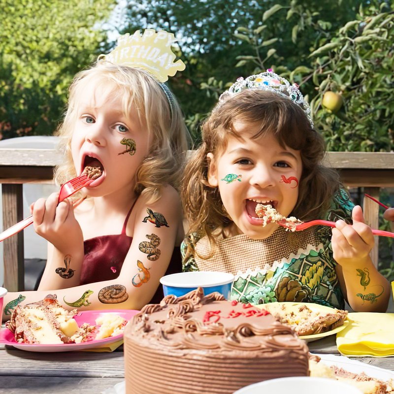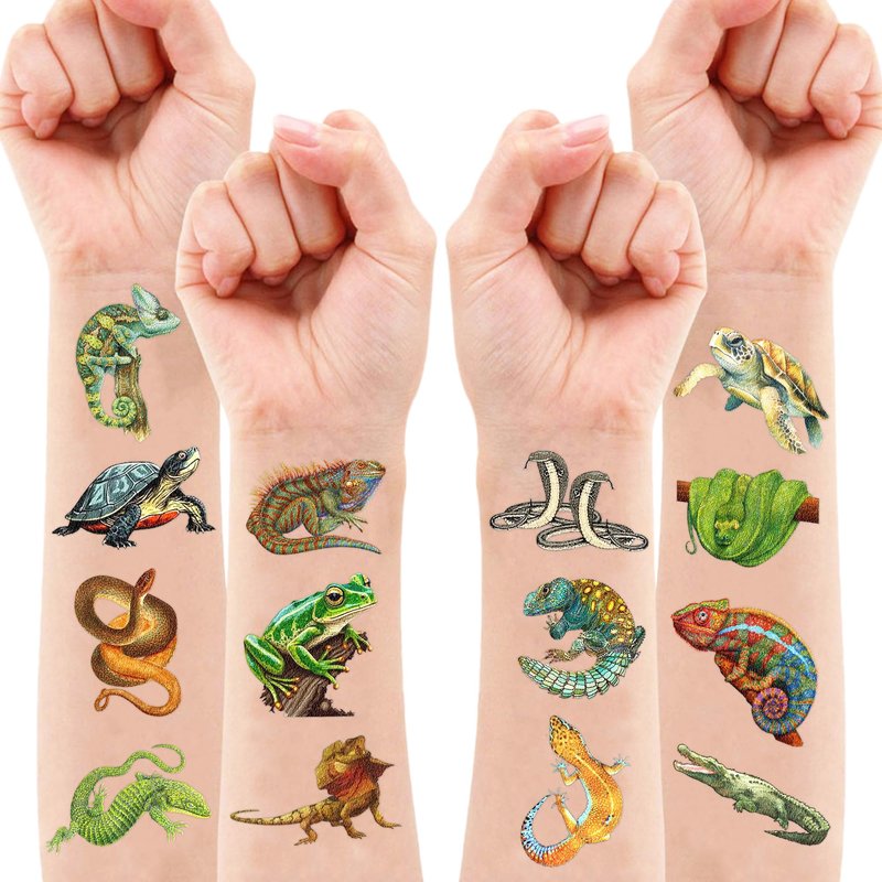 - 🐊REPTILE PARTY FAVORS: These temporary reptile tattoos will look amazing at your celebration! Choose from a ton of incredible realistic reptile designs, including turtle, alligator, frog, snake, and lizard designs. Now grab some accessories to give your event some flair!