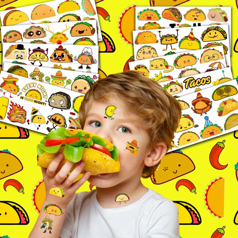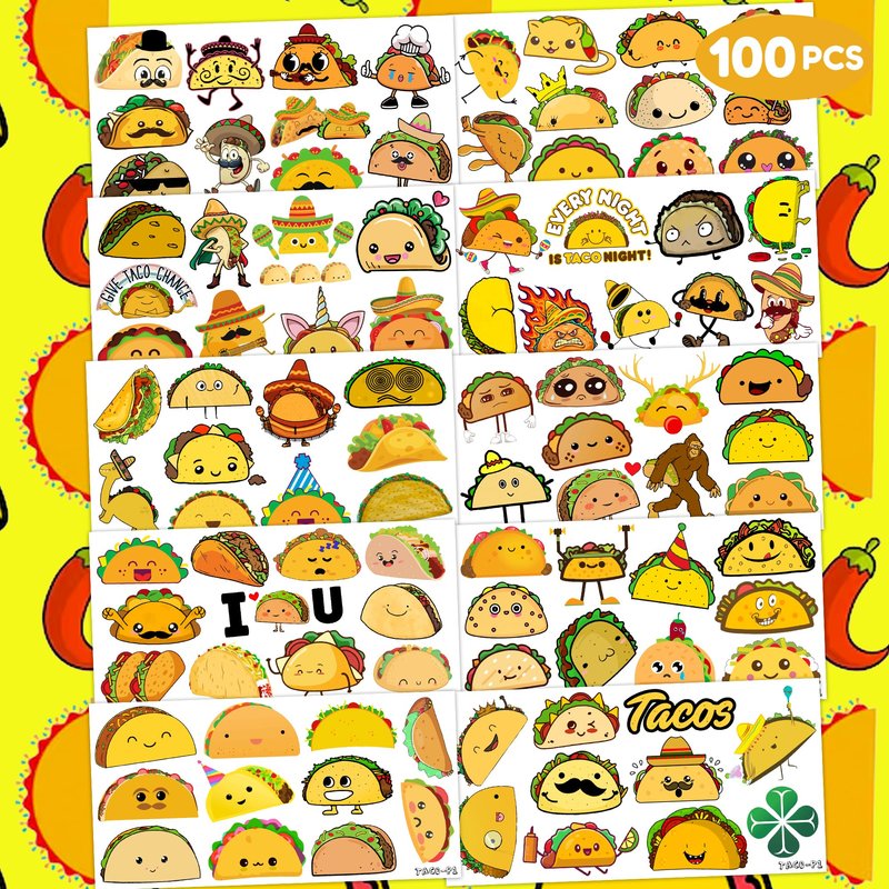 - 🪅MEXICAN PARTY DECORATIONS: Hi everyone! An amazing set of 10 sheets including 100 a size of 6.1 by 3.1 inches. These TACO tattoo pieces will be sent to you quickly, place your order to get these temporary tattoos.