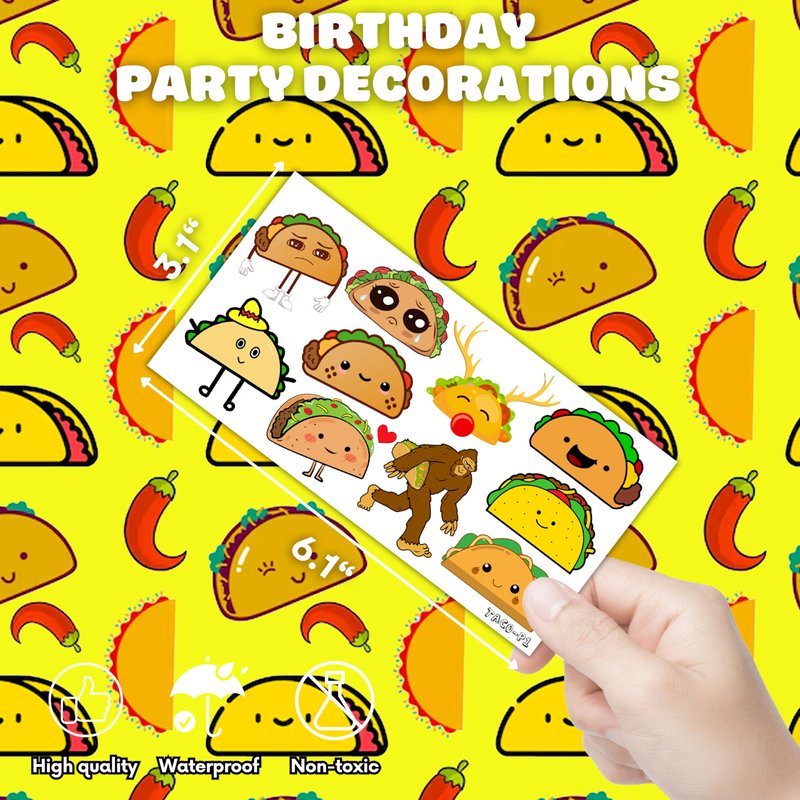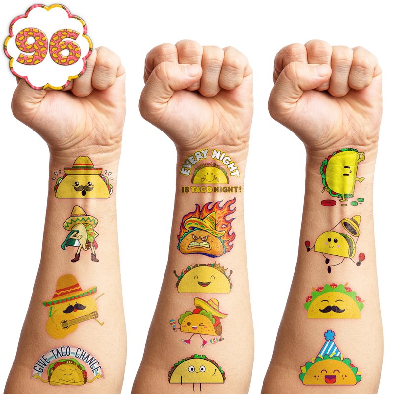 - 🌮TACO PARTY DECORATIONS: At your celebration, these TACO temporary tattoos will look fantastic! Select from a tonne of amazing Taco bout love, taco twosday, threesta, and more. Now grab some gear to add some flare to your event!