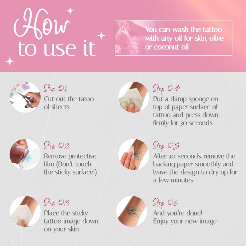 - Super easy to use: these suitable for all skin types tattoo stickers are easily applied - just place chosen design on clean and dry skin, moisten with damp towel and enjoy cute results; can be quickly removed with oil