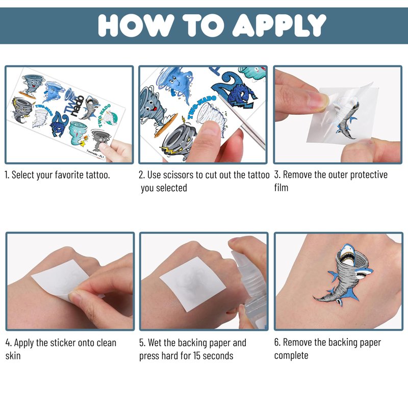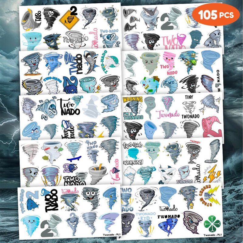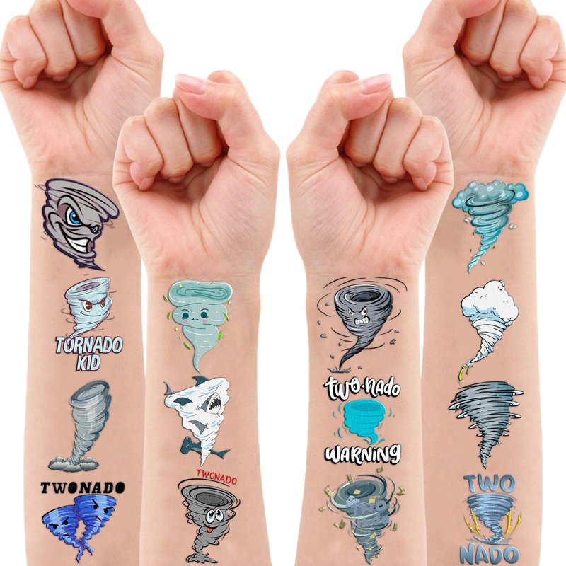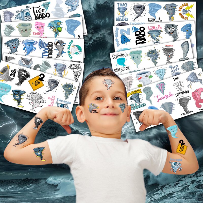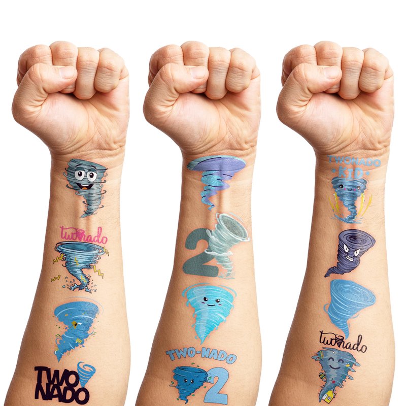 - Pattern rich: Two Nado Tornado Funny Weather Second Twonado Temporary Tattoos include Ten Sheets One Hundred PCS, the size of each sheet is Six point One * Three point One inches. Easy to share,even if a lot of people's parties, you can have a different tattoo with others.These adorable tattoos will keep you and your little ones – and their friends – occupied for a while.