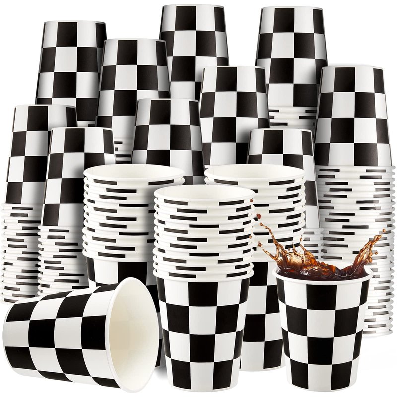 100 Pieces Checkered Cups 9 oz Checkered Paper Flag Race Car Cups Party Supplies Black and White Cups Bulk Disposable Beverage Cups for Checkered Themed Birthday Party Decorations