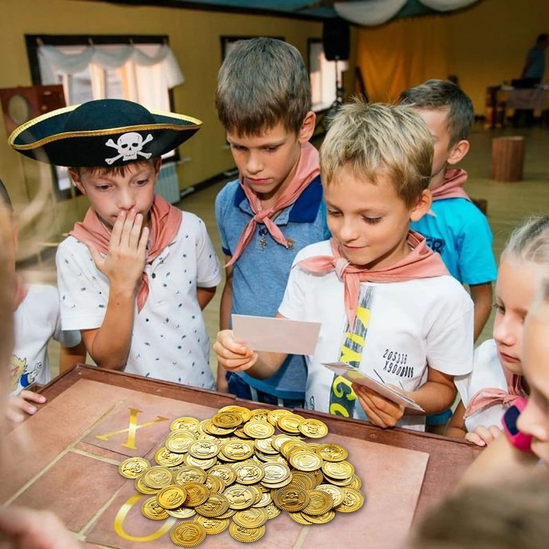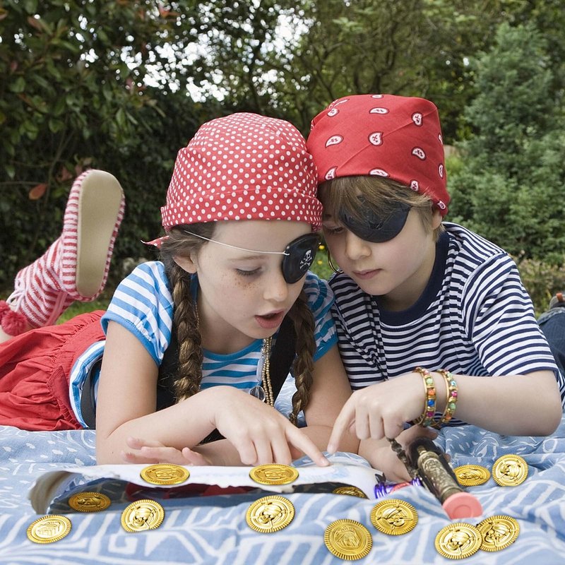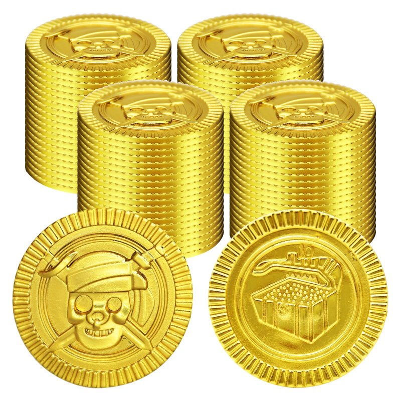 - Pirate Treasure Gold Play Coins - The plastic gold coins are designed with a pirate treasure theme, making them wonderful for pirate-themed parties or treasure hunt games. The coins have a shiny and reflective surface, adding a touch of realism to your pirate treasure.
