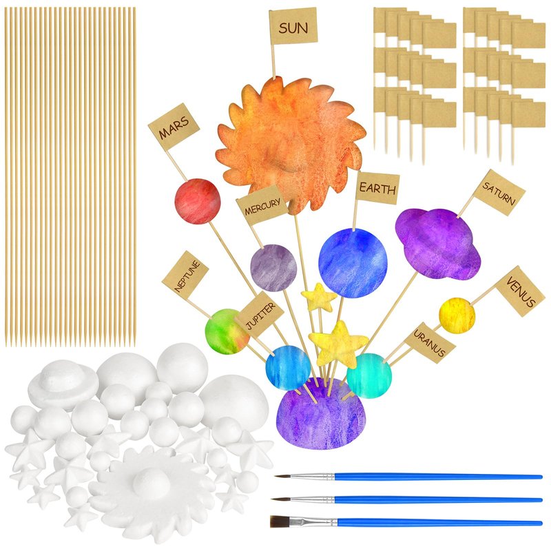 - Package includes: you will receive a solar system model foam ball kit, which includes 30 mixed-size polystyrene balls, 40 toothpick flags, 27 bamboo sticks and 3 paintbrushes that you can use to create your own model of the solar system, note:we do not supply paint, please prepare your own paint