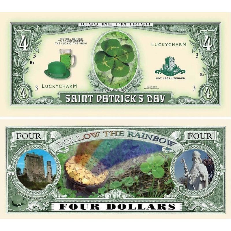 100 Saint Patrick Four Dollar Bill with Bonus “Thanks a Million” Gift Card Set