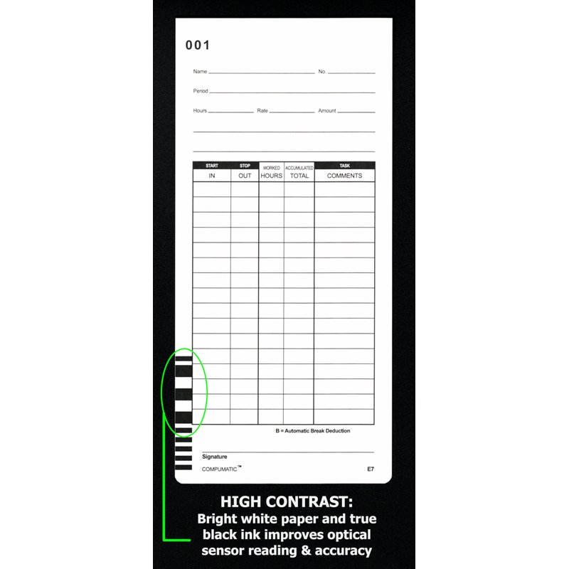 - 10 packs of 100 time cards per pack, Bar coded numbered 1-100 (E7-100)