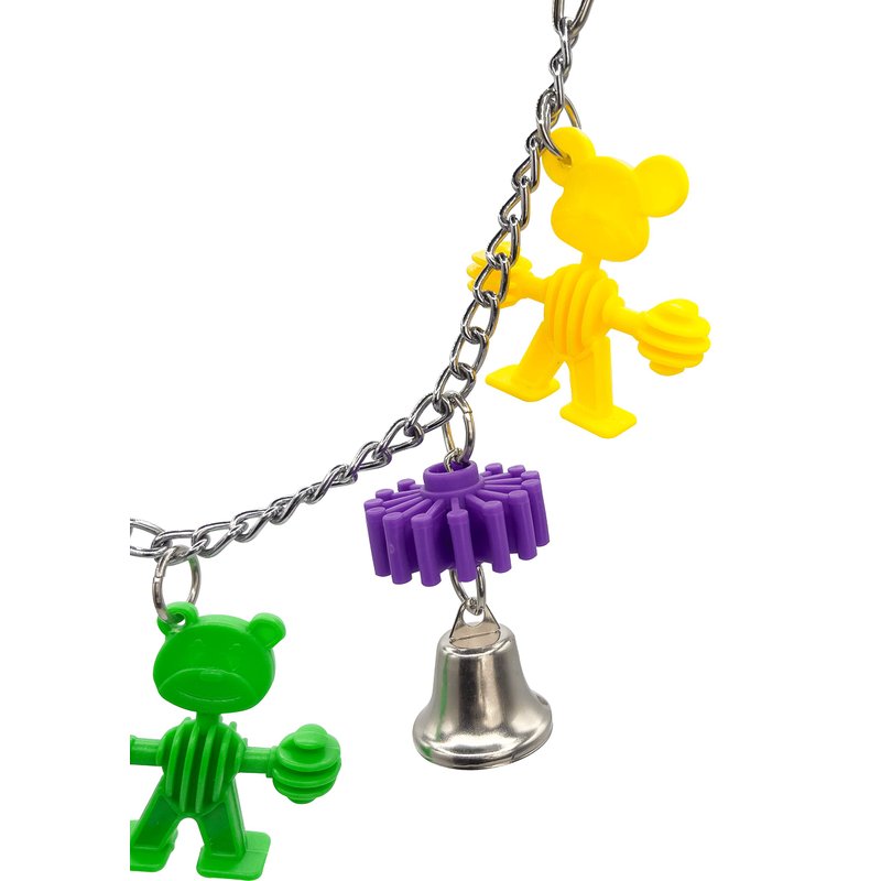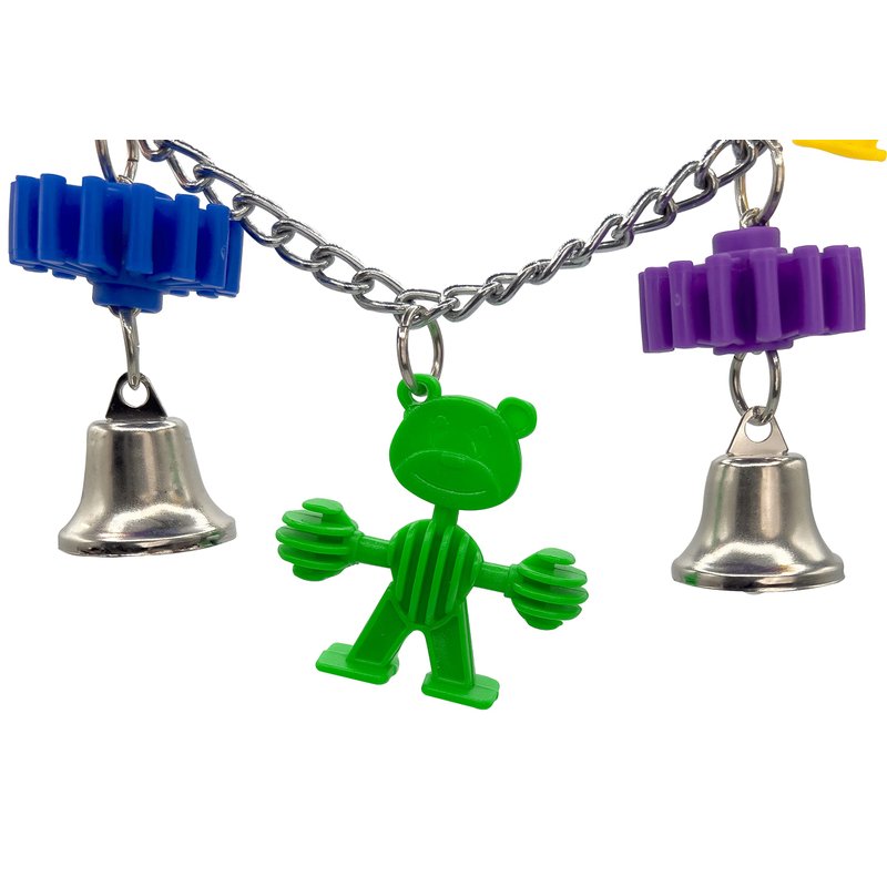 The 1008 Gear Bell Grabber from M&M Bird Toys is a colorful and fun to play with toy. This flexible bird toy has a straightforward design to thrill pets of all types and is easy to hang with its included (2) quick link connectors. At both ends of the sturdy link chain are a quick link connector. These connectors make for fast hanging in the cage and let the toy be hung in multiple different ways. The chain the toy is made from is 100% birds safe and ready for pulling fun. On the chain there are (5) sturdy metal rings that hang different beak and feet pleasing items. On the ends and in the middle your pet will find interesting plastic figurines that have assorted cute face and grooved hands and bodies. The smooth sides and interesting shape of the figures make them great fun for pets to investigate. These figurines are also perfect objects to hang other materials and items from. On the remaining (2) metal rings hang small lengths of chain that are adorned by colorful plastic gears. On the bottom of these lengths of chain are another set of metal rings that each hang a metal bell. These bells make great bird pleasing sounds when your pet interacts with the toy. Toys like these are great for filling up a particular space in the cage as it can be hung in so many different ways. Even move the quick link connectors to other chain links to hang the toy in ever changing ways. The bright colors and bird pleasing design make it an easy addition for cages. The lightweight materials are easy to pull and fun for pets to feel with their beak and feet. This bird toy ships in bright assorted bird pleasing colors for the figurines and plastic foot gears. [Specifications when hung horizontally] Length: (11) inches or (27.9) cm Height: (3) inches or (7.6) cm Depth: (1.5) inches or (3.8) cm Weight: Under (4) ounces A bird safe cage toy Individually hand-crafted by Mai in our small Florida shop