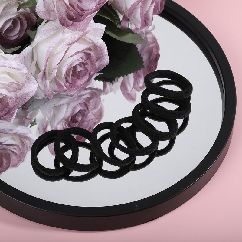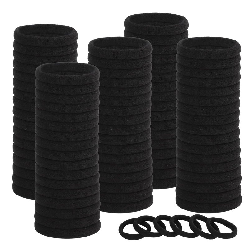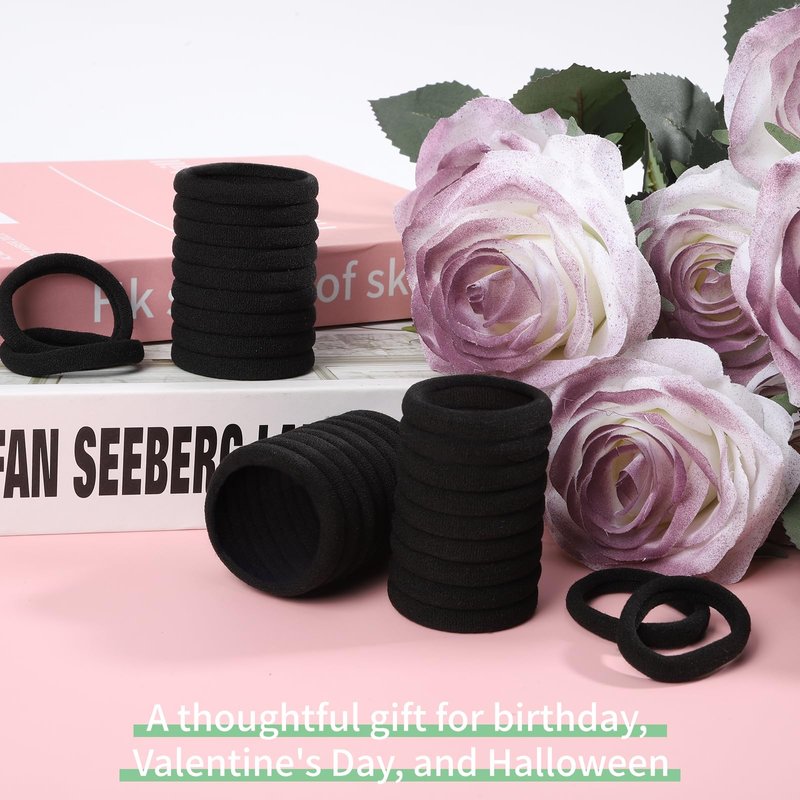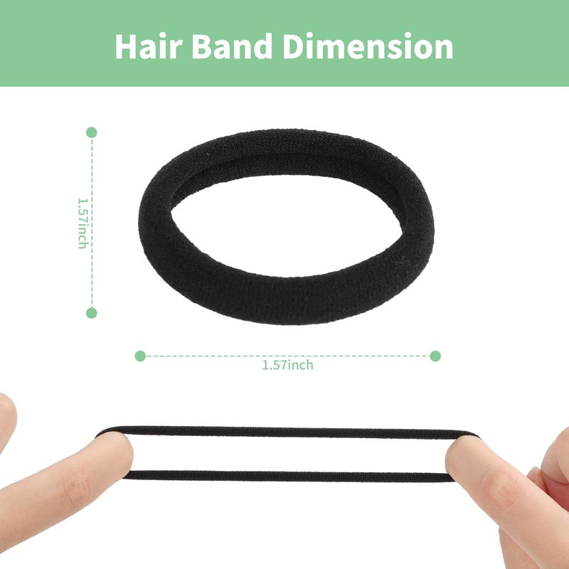 - Quantity and Size: The package contains 100pcs high-quality black elastic bands, measuring 1.57”*1.57”, which is sufficient for your daily use. Ponytail holders are easy to lose. You can put them in the bathroom, living room, dressing table, car, gym bag, and any other place where you need them, reducing rummage and saving time.