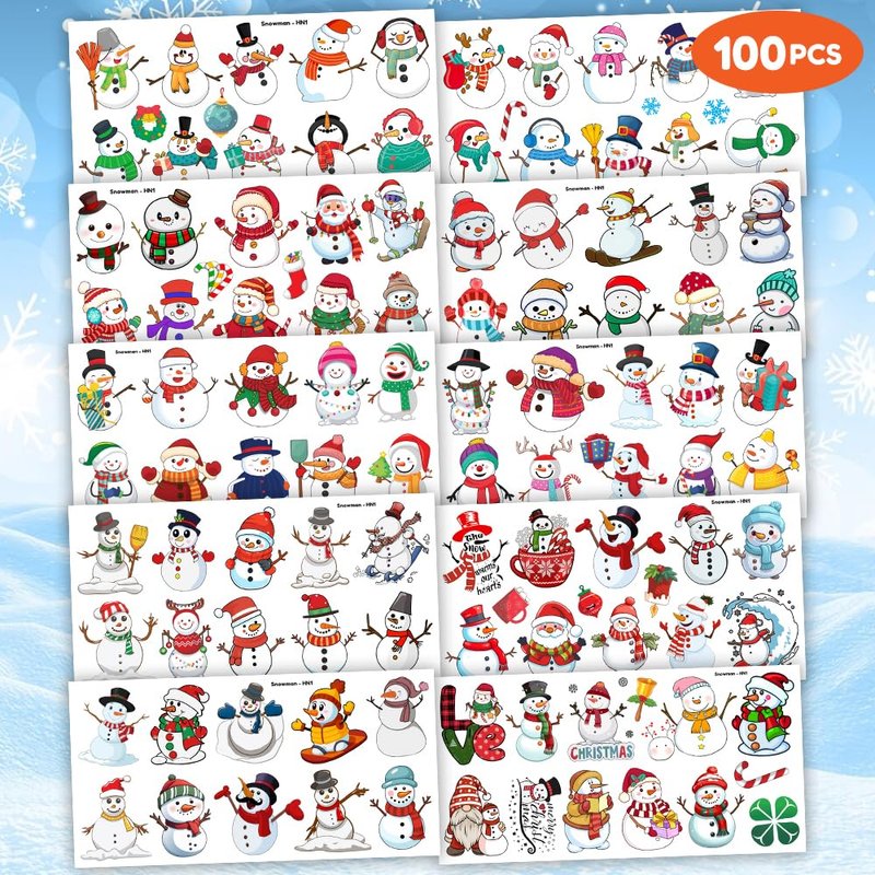 100PCS Chritsmas Snowman Temporary Tattoos Stickers Winter Theme Birthday Party Decorations Décor Supplies Favors Merry Xmas Snowflakes Tattoo Sticker Gifts For Boys Girls School Prizes Carnival