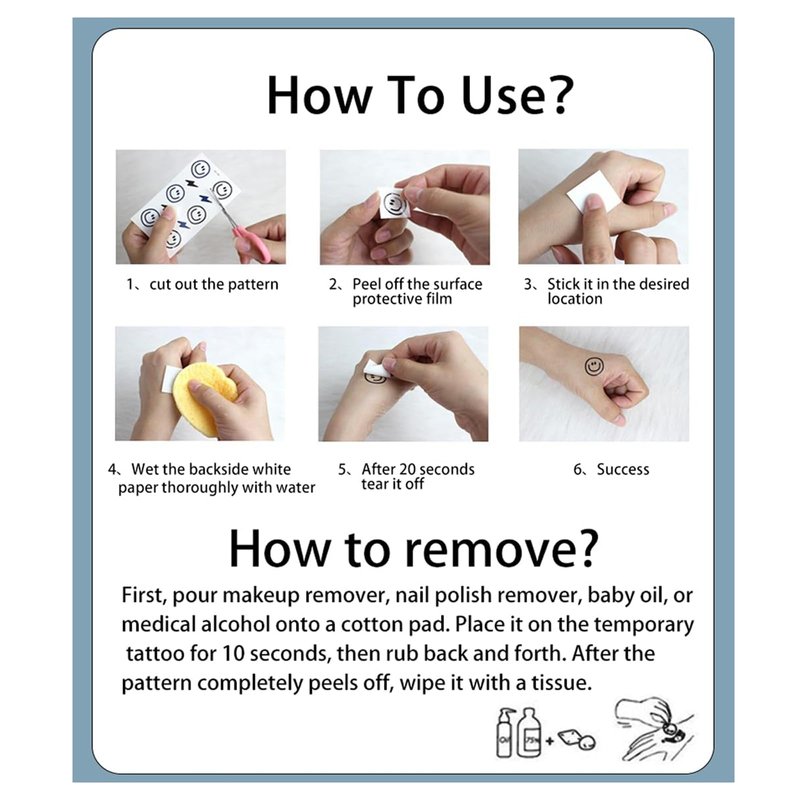 - ⛱️Easy to apply: 1.Place tattoo on clean + dry skin 2. Lightly dab the tattoo with damp paper towel 3. Remove paper, allow tattoo to dry and enjoy! Instructions included on back of each sheet :)