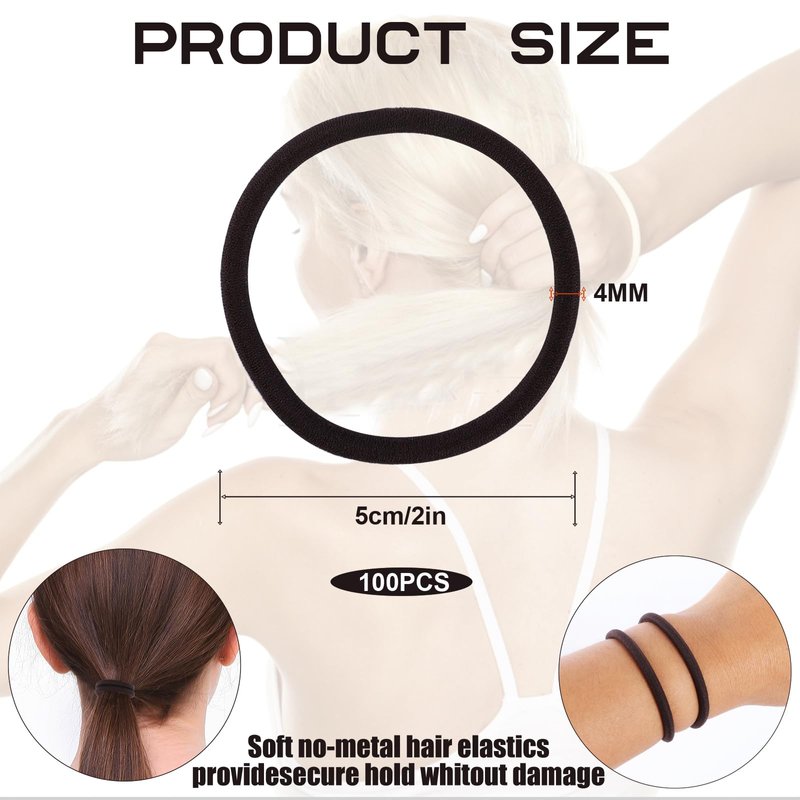 - 1. The hair elastic is 4 mm in thickness and 2" in diameter, These no-metal thick hair scrunchies are soft and stretchy. Includes 100pc onytails.