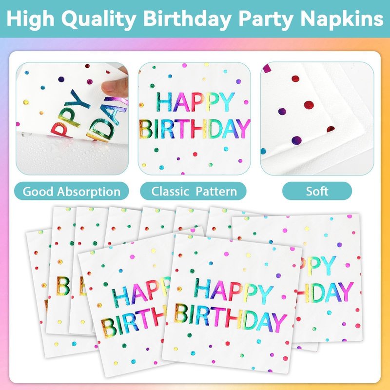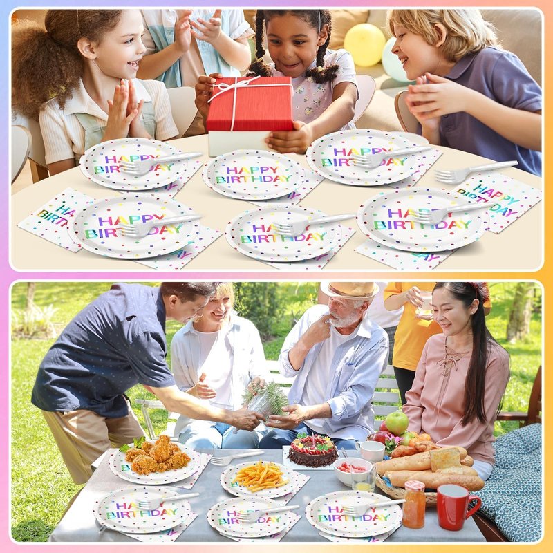 - Iridescent polka dot design: The colorful paper plates and napkin decoration feature the iridescent polka dot pattern and the iridescent phrase "Happy Birthday" that adds a charming touch to your party decor. Whether you're hosting a birthday party for kids, teens, or adults, this versatile tableware set is sure to delight your guests and make your event memorable.