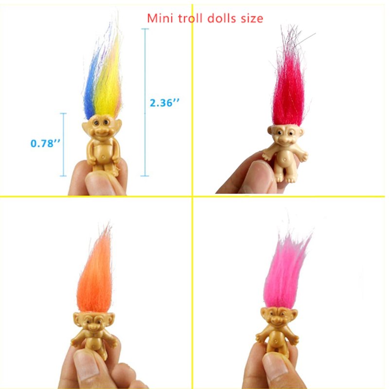 Size: Each good luck troll is about 3cm tall(including the hairs), tiny and lightweight.Please allow slight difference in size due to manual measurement.
