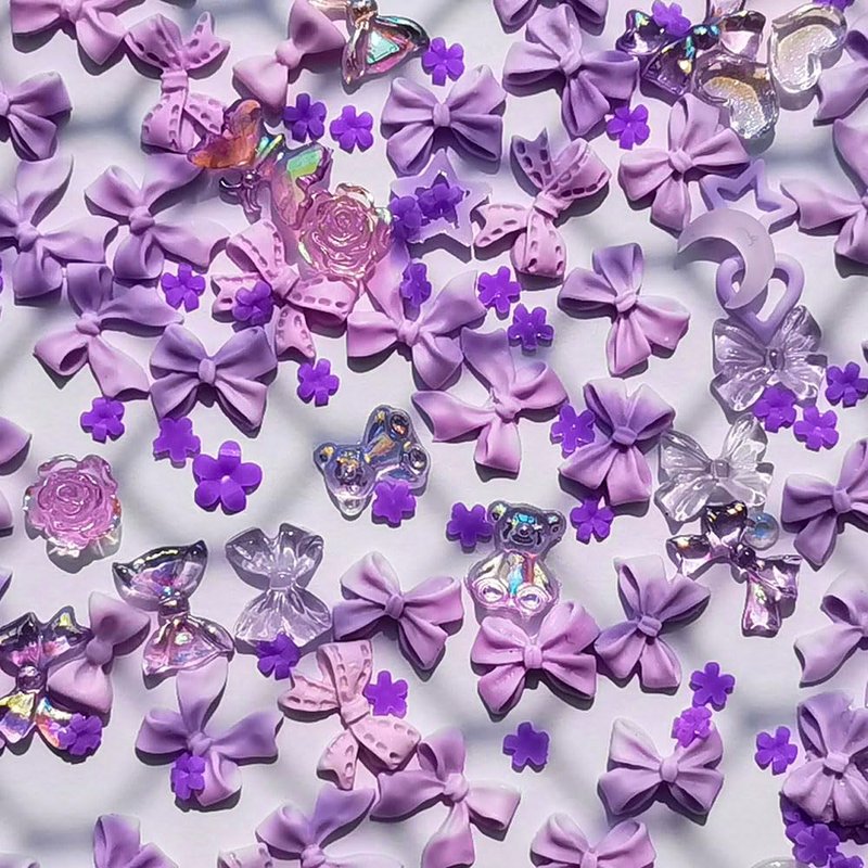 100pcs Purple Flower Bow Nail Charms Resin Nail Bows Nail Flowers 3D Nail Art Charms Cute Heart Moon Camellia Nail Charm Bear Butterfly Charms for Nails Design Bows for Nails Charms Nail Accessories