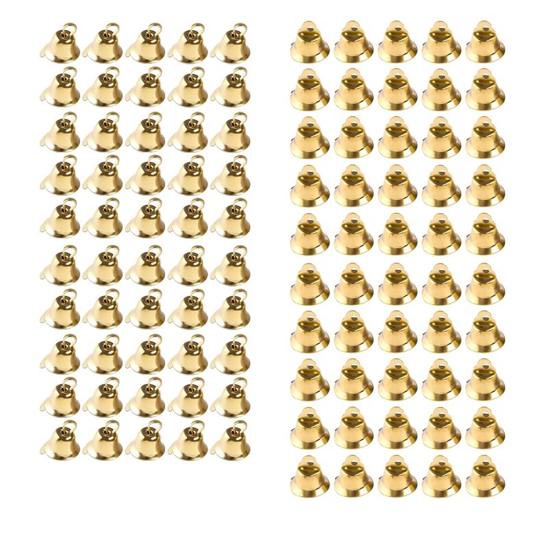 100PCS Small Gold Bells Mini Bells for Crafts,50PCS 0.39 Inch and 50PCS 0.55 Inch Decorative Bells Christmas Tree Pendants for Craft Making and Favor Decorating