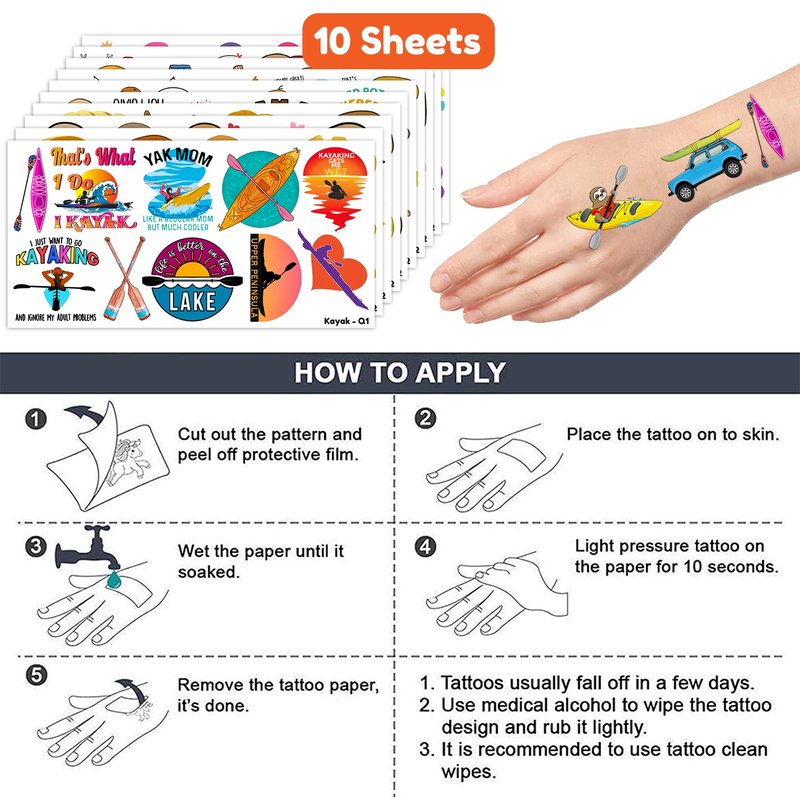 Cute Summer Kayak Kayaking Beach Canoe Kayaker Hawaiian Surf Surfing Surfer California Birthday Party Supplies: 10 Sheets Summer Kayak Kayaking Canoe Kayaker temporary tattoos stickers, Have a variety of themed color, Children can easily Summer Kayak Kayaking Canoe Kayaker stickers and take unique photos to make fond memories. The size of each sheet is 6.1 * 3.1 inches. Cute Summer Kayak Kayaking Beach Canoe Kayaker Hawaiian Surf Surfing Surfer California Birthday Party Decoration: The set contains instructions for use and is easy to use. Summer Kayak Kayaking Canoe Kayaker tattoo stickers can be applied on arms, face, hands, neck, shoulders, legs, wrists and ankles to make you look cool at all kinds of parties. Popular hit with your kids. You can apply them to your body or some smooth objects, for example, glass, stationery, paper, crafts cups, cabinet, bottle. Cute And Funny Summer Kayak Kayaking Beach Canoe Kayaker Hawaiian Surf Surfing Surfer California Themed Tattoos: Cute Summer Kayak Kayaking Beach Canoe Kayaker Hawaiian Surf Surfing Surfer California Temporary tattoos Stickers, features an assortment of themed, colors are bright, and designs are adorable, use them as party favors and your kids will love. Perfect for themed party, birthday activities, school reward and other party events. They will be your kids' favorite small gifts. More Safety & Healthy Choice: These temporary tattoos are made of high quality safety and green paper, Non-allergenic and totally safe for your kid's skin. Simply wet the tattoo with water and stick transferred them onto your body, hands, faces and arm you like. Tattoos will last from 3 to 5 days ,it also can be easily removed with baby oil, makeup remover or rubbing alcohol. Not recommended for people with a history of sensitive skin, if symptoms appear, stop using immediately. How to Use: Cut out tattoo of choice and remove clear sheet. Place tattoo face down on skin. Wet the tattoo thoroughly with a sponge. After 20-30 seconds, gently remove the backing paper. Allow the tattoo to dry. Very easy to use.