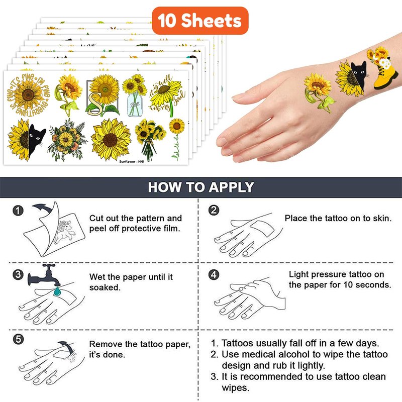 - Pattern rich: Yellow Sunflower Spring Summer Sun Sunshine Flowers Temporary Tattoos for Kids include 10 Sheets 100 PCS, the size of each sheet is 6.1 * 3.1 inches. Having a variety of characteristics, shapes and vibrant colors can stimulate your children's imaginations and bring a creative atmosphere to your Sunflower Party.