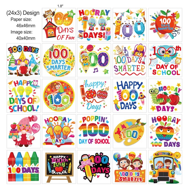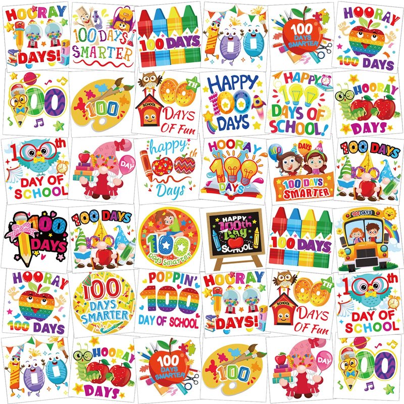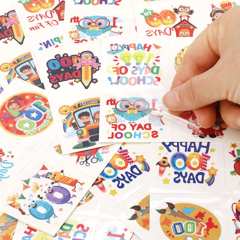 - Happy 100 Days of School Temporary Tattoos for Kids: You will receive 72 pieces Thanksgiving fake tattoos with 24 styles design, include pencils, blackboard, alarm clock, school bag, school bus, blackboard,notebook, colorful balloons, tellurians, crayons and so on school relative designs, full of school campus atmosphere, enough for you to share with classmates and teachers during on Hooray 100 days party celebration!