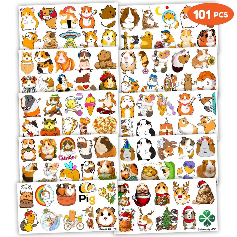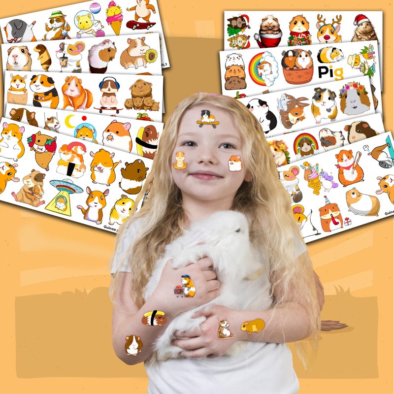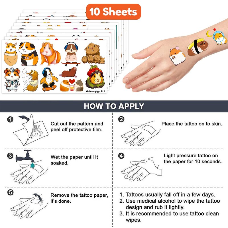 - Pattern rich: Cute Guinea Pig Hamster Pet Mouse Animal Temporary Tattoos include 10 Sheets 110 PCS, the size of each sheet is 6.1 * 3.1 inches. Easy to share,even if a lot of people's parties, you can have a different tattoo with others.These adorable tattoos will keep you and your little ones – and their friends – occupied for a while.