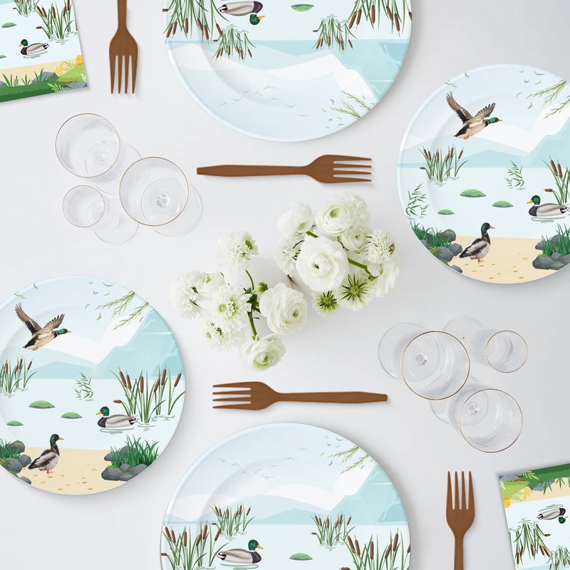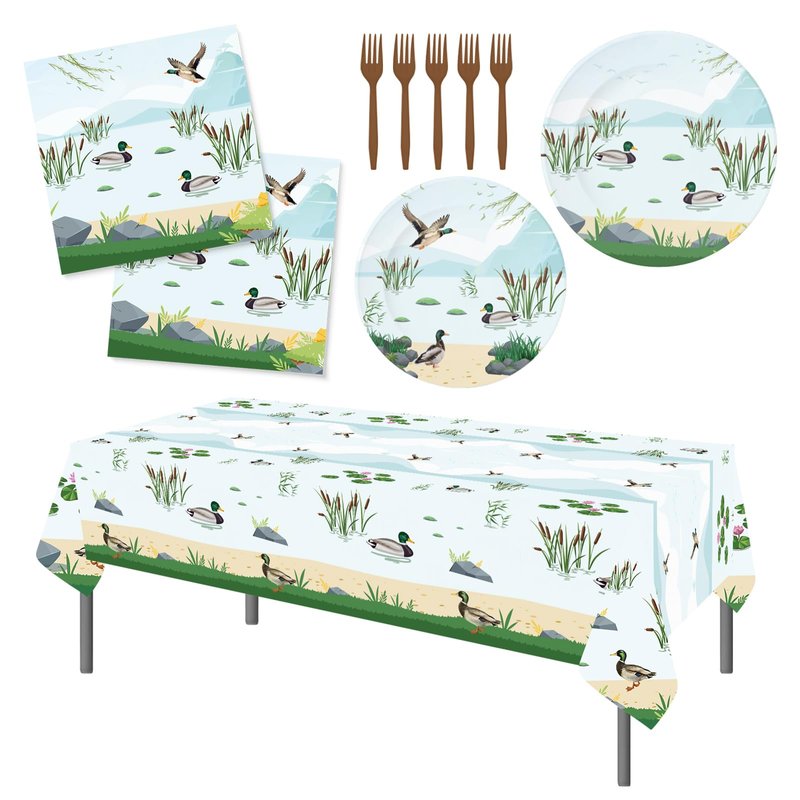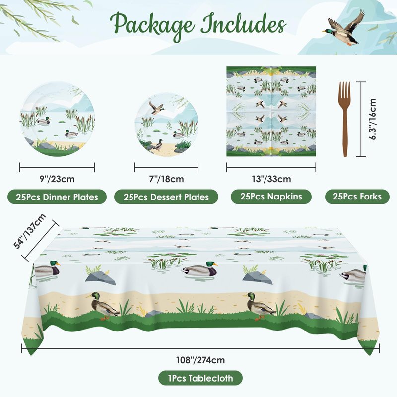- Party Package for 25: This mallard duck birthday party supplies dinnerware set provides everything you need for 25 guests, including 25 pcs 9'' dinner paper plates, 25 pcs 7'' dessert plates, 25 pcs napkins, 25 pcs plastic forks, and 1 pcs duck theme tablecloth