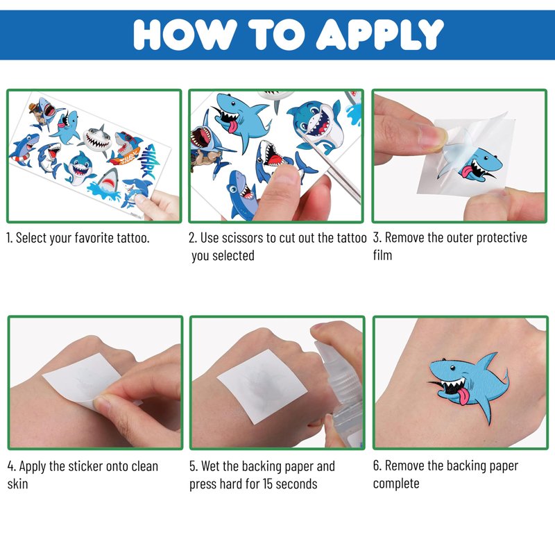 - 🦈 EASY TO USE AND REMOVE : You can place them on your hands, arms, face, or any comfortable area. Simply cut out each tattoo from the sheets and remove the clear protective layer. Wet the tattoo thoroughly with water, wait for 20-30 seconds, and then remove the backing paper. The result will be a velvety, long-lasting tattoo.