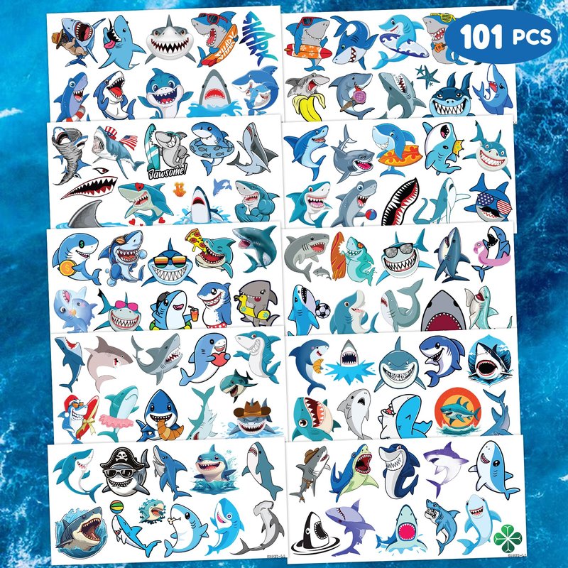 - 🦈 TATTOOS FOR SHARK THEMED DECORATION: SHARK TATTOOS for people who love Shark, Sea Animal. Featuring 10 sheets with 101 pcs of lovely, fun and colorful design. Each sheet measures 6.1 * 3.1 inches. You can temporarily tattoo them on your body or objects such as phones, bottles, laptop…