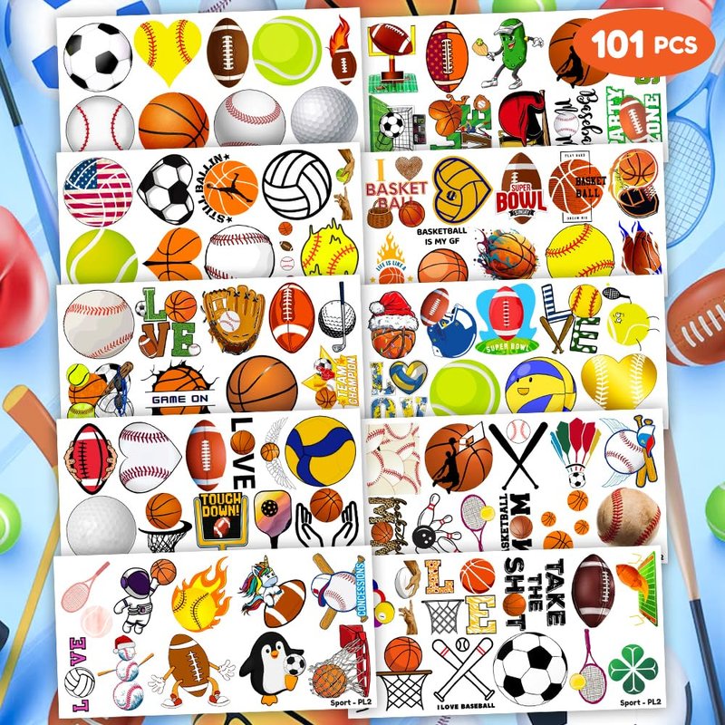 - Pattern rich: Sports Ball Cute Basketball Football Baseball Soccer Temporary Tattoos include 10 Sheets 101 PCS, the size of each sheet is 6.1 * 3.1 inches. Easy to share,even if a lot of people's parties, you can have a different tattoo with others.These adorable tattoos will keep you and your little ones – and their friends – occupied for a while.
