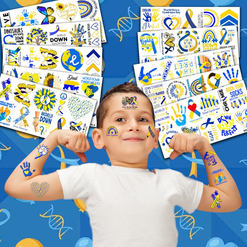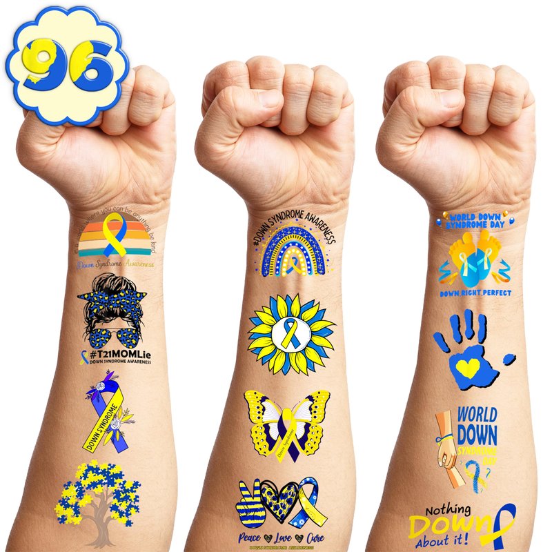 - Widely used: Funny Down Syndrome Awareness Care Blue Yellow Ribbon Temporary Tattoos pieces are suitable for many occasions such as birthday party supplies, party decorations, party favors, party bags, DIY decorations, pool and the beach or gift.Temporary tattoos are the best party favors and goodie bags fillers ever for any kind of celebration!