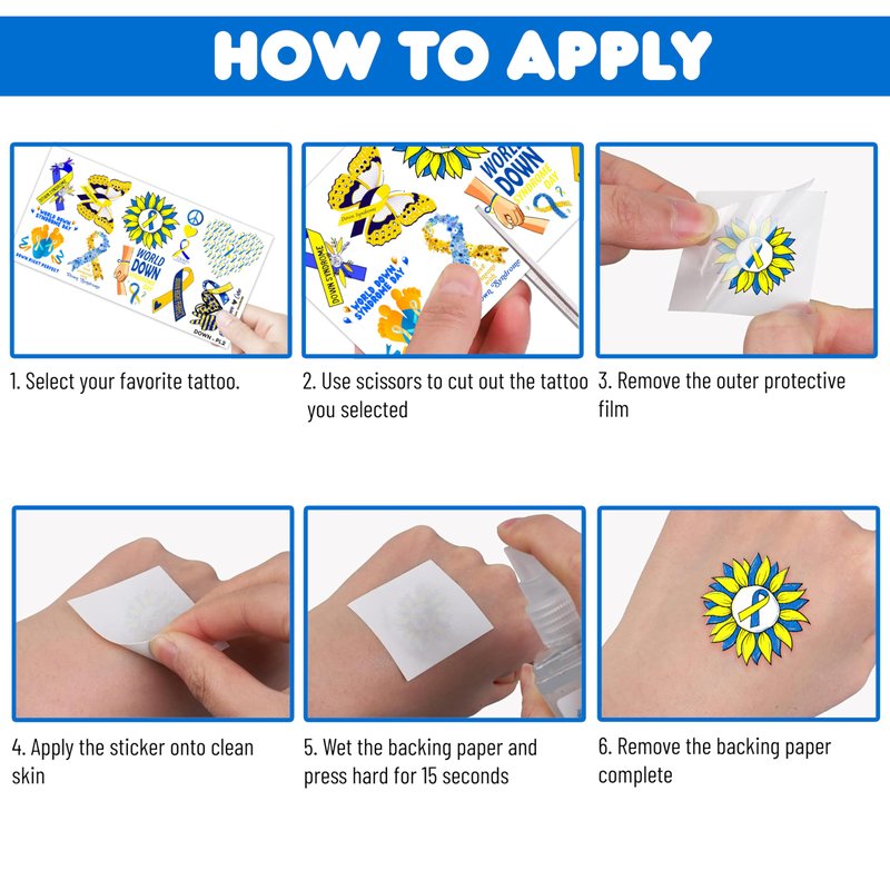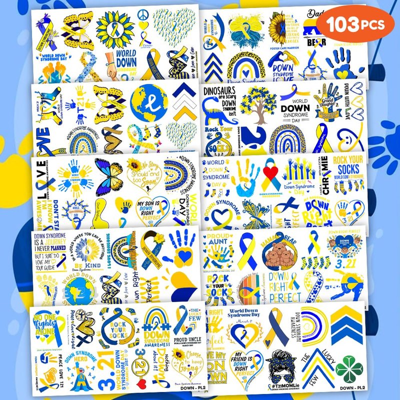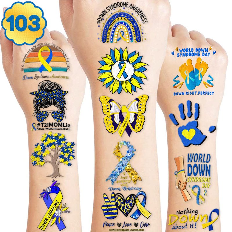 - Pattern rich: Funny Down Syndrome Awareness Care Blue Yellow Ribbon Temporary Tattoos include 10 Sheets 103 PCS, the size of each sheet is 6.1 * 3.1 inches. Easy to share,even if a lot of people's parties, you can have a different tattoo with others.These adorable tattoos will keep you and your little ones – and their friends – occupied for a while.