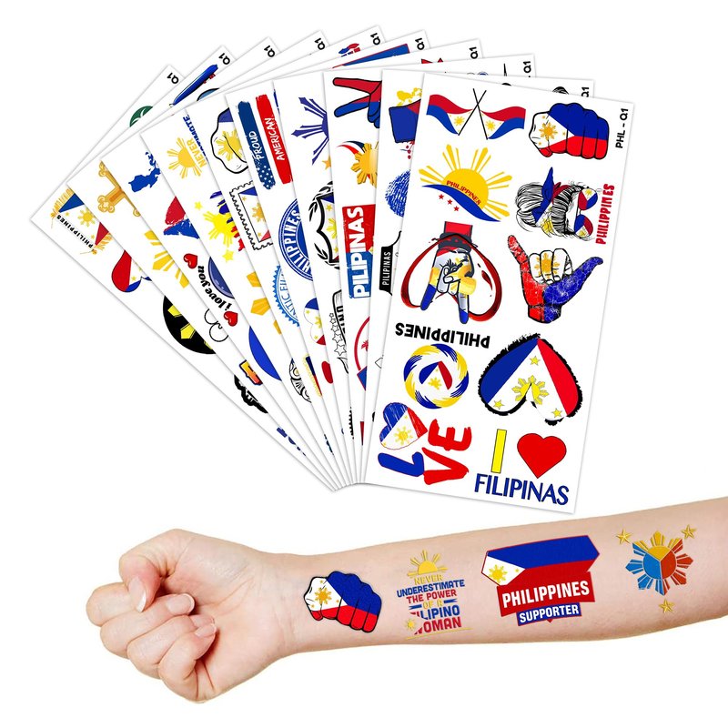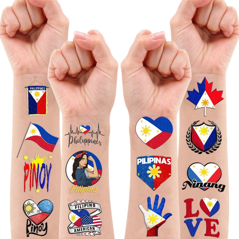 - Cute Philippines Filipino Flag Pride Star Sun Flags Birthday Party Decoration: The set contains instructions for use and is easy to use. Philippines Filipino Flag Pride Star Sun Flags tattoo stickers can be applied on arms, face, hands, neck, shoulders, legs, wrists and ankles to make you look cool at all kinds of parties. Popular hit with your kids. You can apply them to your body or some smooth objects, for example, glass, stationery, paper, crafts cups, cabinet, bottle.