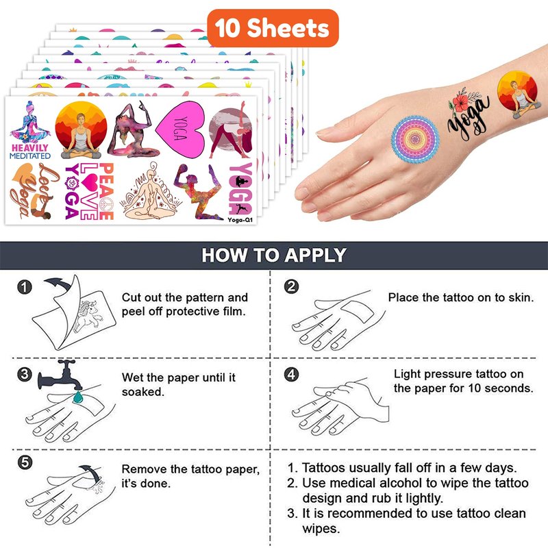Cute Yoga Lover Mandala Flowers Birthday Party Supplies: 10 Sheets Meditation Yoga Instructor temporary tattoos stickers, Have a variety of themed color, Children can easily Meditation Yoga Instructor stickers and take unique photos to make fond memories. The size of each sheet is 6.1 * 3.1 inches. Cute Yoga Lover Mandala Flowers Birthday Party Decoration: The set contains instructions for use and is easy to use. Meditation Yoga Instructor tattoo stickers can be applied on arms, face, hands, neck, shoulders, legs, wrists and ankles to make you look cool at all kinds of parties. Popular hit with your kids. You can apply them to your body or some smooth objects, for example, glass, stationery, paper, crafts cups, cabinet, bottle. Cute And Funny Yoga Lover Mandala Flowers Themed Tattoos: Cute Meditation Yoga Instructor Temporary tattoos Stickers, features an assortment of themed, colors are bright, and designs are adorable, use them as party favors and your kids will love. Perfect for themed party, birthday activities, school reward and other party events. They will be your kids' favorite small gifts. More Safety & Healthy Choice: These temporary tattoos are made of high quality safety and green paper, Non-allergenic and totally safe for your kid's skin. Simply wet the tattoo with water and stick transferred them onto your body, hands, faces and arm you like. Tattoos will last from 3 to 5 days ,it also can be easily removed with baby oil, makeup remover or rubbing alcohol. Not recommended for people with a history of sensitive skin, if symptoms appear, stop using immediately. How to Use: Cut out tattoo of choice and remove clear sheet. Place tattoo face down on skin. Wet the tattoo thoroughly with a sponge. After 20-30 seconds, gently remove the backing paper. Allow the tattoo to dry. Very easy to use.