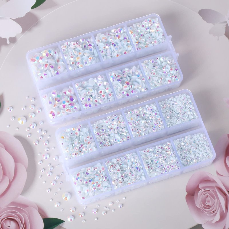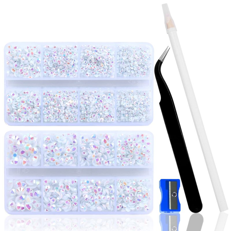 - TWO BOXES RHINESTONES: 10400PCS jelly white rhinestones for crafts & 15 cm pencil sharpener and tweezer & picker pen, you get the box rhinestones and can easy to make the crafts! Resin rhinestones use advanced diamond cutting and AB coating technology, their shine is forever / never fades. Size - 2MM: 5000PCS, 3MM: 2800PCS, 4MM: 1600PCS, 5MM: 800PCS, 6MM: 200PCS, total 10400PCS.