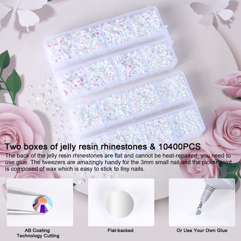 10400PCS White AB Rhinestones, Jelly Resin Rhinestones for Nails, Flatback Non Hotfix Crystals DIY Rhinestones for Crafts with 15 cm Pencil Sharpener and Tweezer & Picker Pen (White AB)