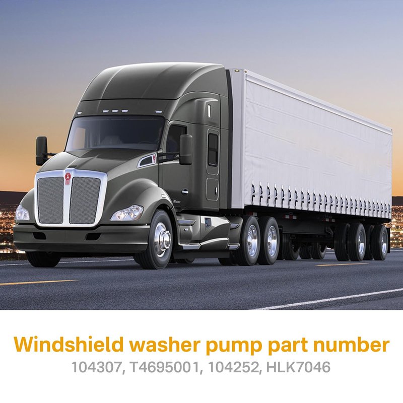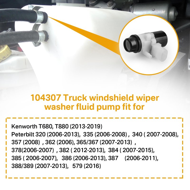 Windshield washer pump part number: 104307, T4695001, 104252, HLK7046 Truck windshield wiper washer fluid pump fit for Kenworth T680, T880 (2013-2019) / Peterbilt 320 (2006-2013), 335 (2006-2008), 337 (2010-2014), 340 ( 2007-2008),357 (2008), 362 (2006), 365/367 (2007-2013), 378(2006-2007), 382 ( 2012-2013), 384 ( 2007-2015), 385 ( 2006-2007), 386 (2006-2013), 387 (2006-2011), 388/389 (2007-2013), 579 (2016)