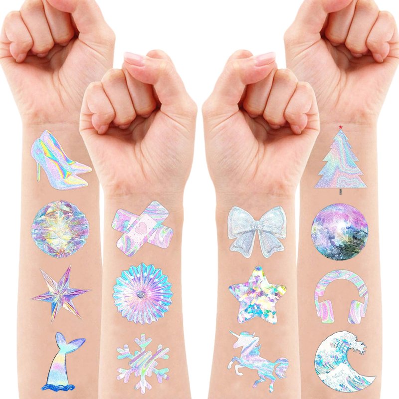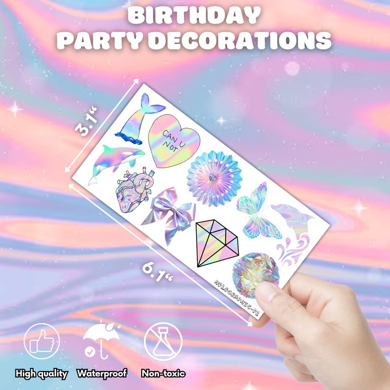 - 🍭HOLOGRAPHIC PARTY: At your party, these transient holographic tattoos will look fantastic! There is a huge assortment of disco, hot pink, holographic, and so on. Now grab some accessories to add some style to your occasion!