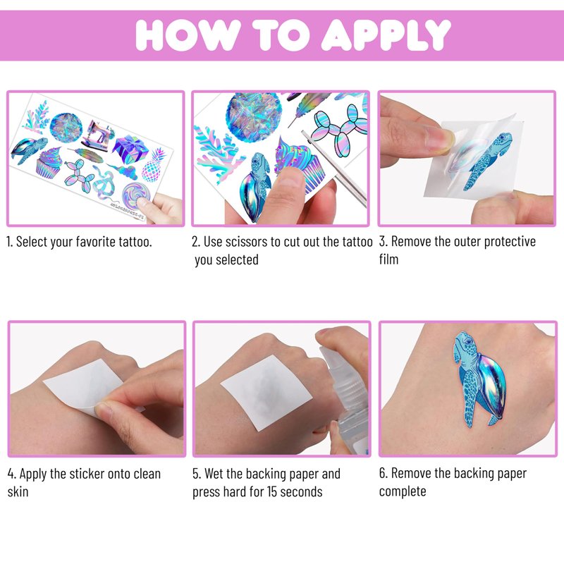 - 📌HOW TO APPLY: First, Cut out the pattern and peel off the protective film. Secondly, place the tattoo on the skin or objects like a water bottle, purse, laptop, phone case, etc. Next, wet the paper until it soaked. Then, light pressure tattoo on the paper for 10 seconds. Finally, remove the tattoo paper once it's done. Go ahead and enjoy your stunning new look! And You'll have a gorgeous, velvety tattoo that can be easily removed with baby oil, soap, or water.