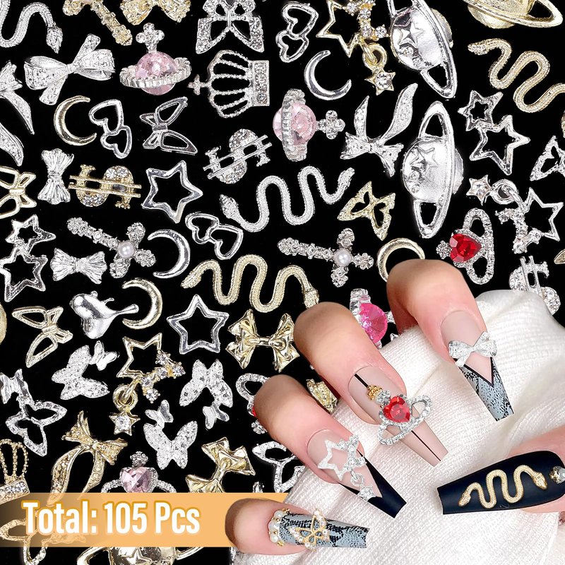 You will get 105 PCS silver gold nail gems charms. Sufficient quantity and rich styles can meet your various needs in DIY nail art or any other handmade projects