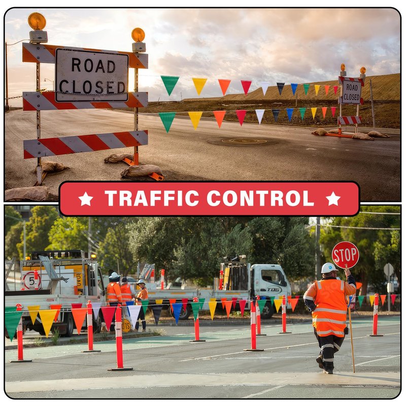 Vibrant Visibility: Elevate safety with our pennant banner flags, meticulously designed for enduring outdoor visibility. Each flag adopts a bright fluorescent color with fade-resistant material, ensuring a vibrant and attention-grabbing display that stands the test of time