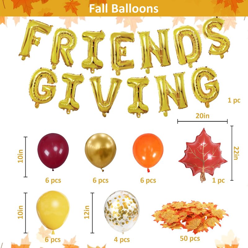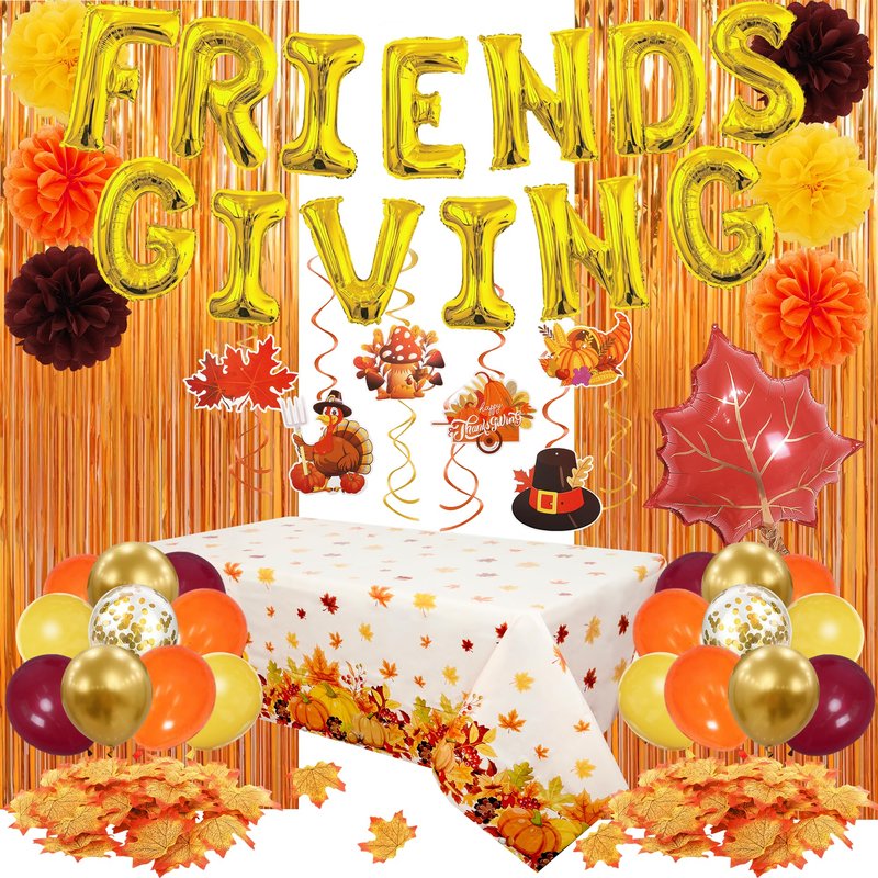 - Friendsgiving Decorations: Include 2pcs foil fringe curtains, 1pc friendsgiving foil banner, 1pc tablecloth, 6pcs paper pompoms, 6pcs hanging swirls with cards, 4pcs double spirals, 1pc maple leaf foil balloon, 50pcs fall leaves, 28pcs fall balloons